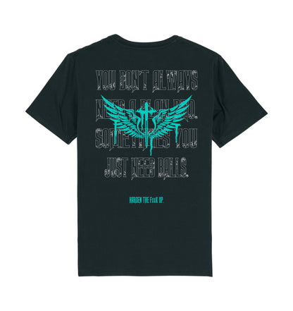 - Design: Türkisfarbenes Schwert mit Flügeln vorn, kraftvolle Botschaft + Logo hinten, langlebiger Siebdruck