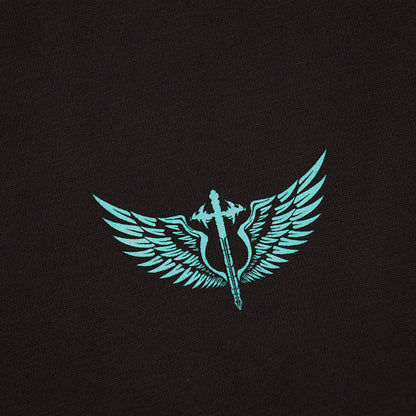 Der schwarze Stoff kombiniert sich perfekt mit dem türkisfarbenen Schwert mit Flügeln auf der Brust sowie dem auffälligen Druck auf der Rückseite.